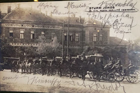 | ,,Sturm János m. kir. posta szállító Debrecen" flottája a Nagyállomás palotájánál. A felvételt a debreceni postamúzeum kiállításán repróztuk |